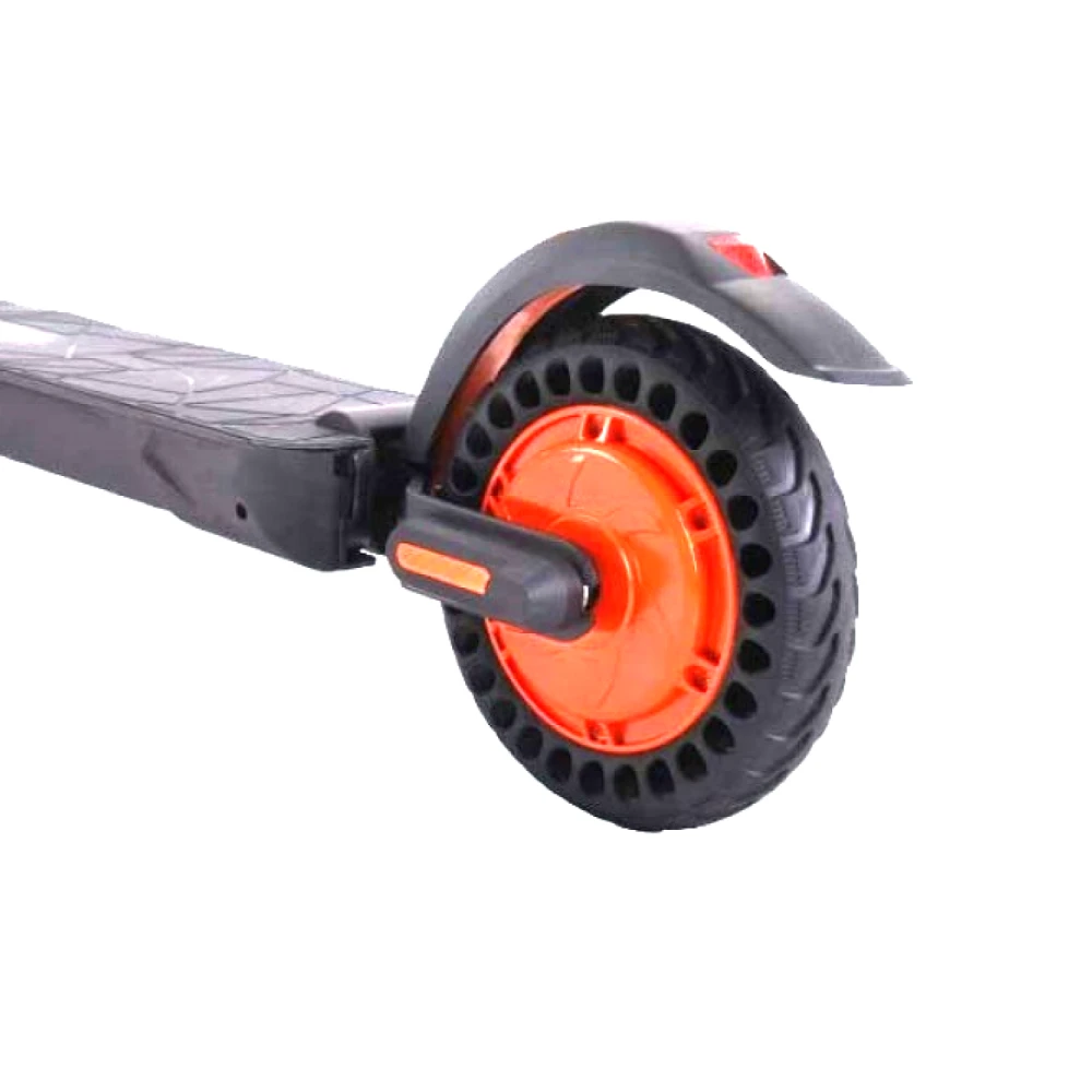 Крепкий корпус из алюминия выдержит нагрузку до 120 кг. Небольшая масса 14,5 кг и высота 108 см позволяет легко сложить и перенести самокат. Самокат оборудован стильными и прочными колёсами с оранжевыми элементами, диаметром переднего и заднего колеса 8 дюймов. Благодаря наличию амортизаторов поездка по городу, несмотря на несовершенства дороги, будет плавной и мягкой. Электронная тормозная система уменьшит расход электроэнергии и сохранит на более долгое время тормозные колодки.