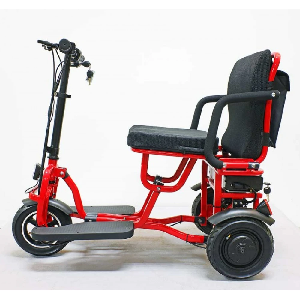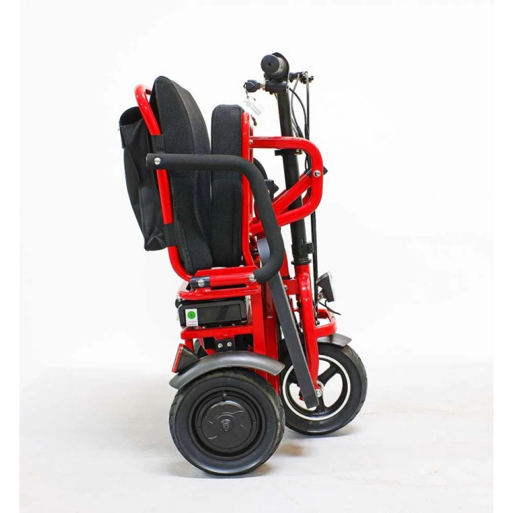 Широкая прорезиненная платформа обеспечивает полноценное размещение стоп, не вызывает усталости ездока. Светодиодная передняя фара допускает движение в вечернее время суток и непогоду. Электротрицикл – современная складная техника, которую сложить можно движением одной руки. В сложенном положении техника напоминает чемодан с ручкой.