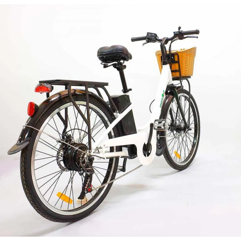 Электровелосипед GreenCamel Бриз (R26 350W 36V 10Ah) Алюм, 6скор – облегченная модель техники весов 22 кг и грузоподъемностью в 110 кг стала хитом продаж наступившего сезона. Первое ознакомление с моделью заявляет, что она создана для слабого пола. Объемная удобная для продуктов корзина, классический белый тон привлекают любителе комфорта и удобства. На самом деле электровелосипед рассчитан на женскую и мужскую категорию. Подтверждением тому являются совершенствованные технические характеристики.